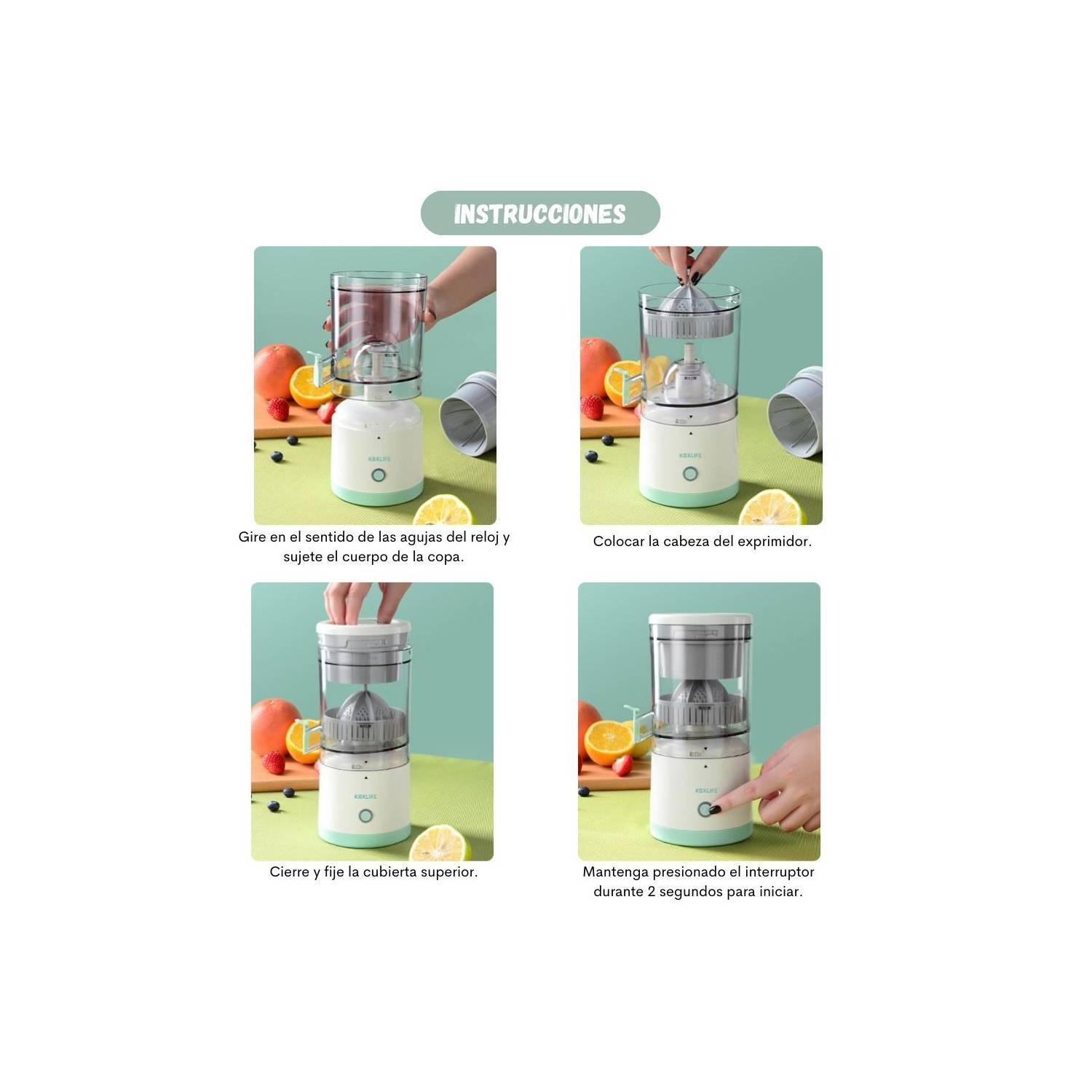 - Fácil de usar: Solo tienes que cortar tu fruta favorita por la mitad, colocarla en el exprimidor, presionar un botón y ¡listo! Obtén el jugo fresco de manera rápida y sin esfuerzo.