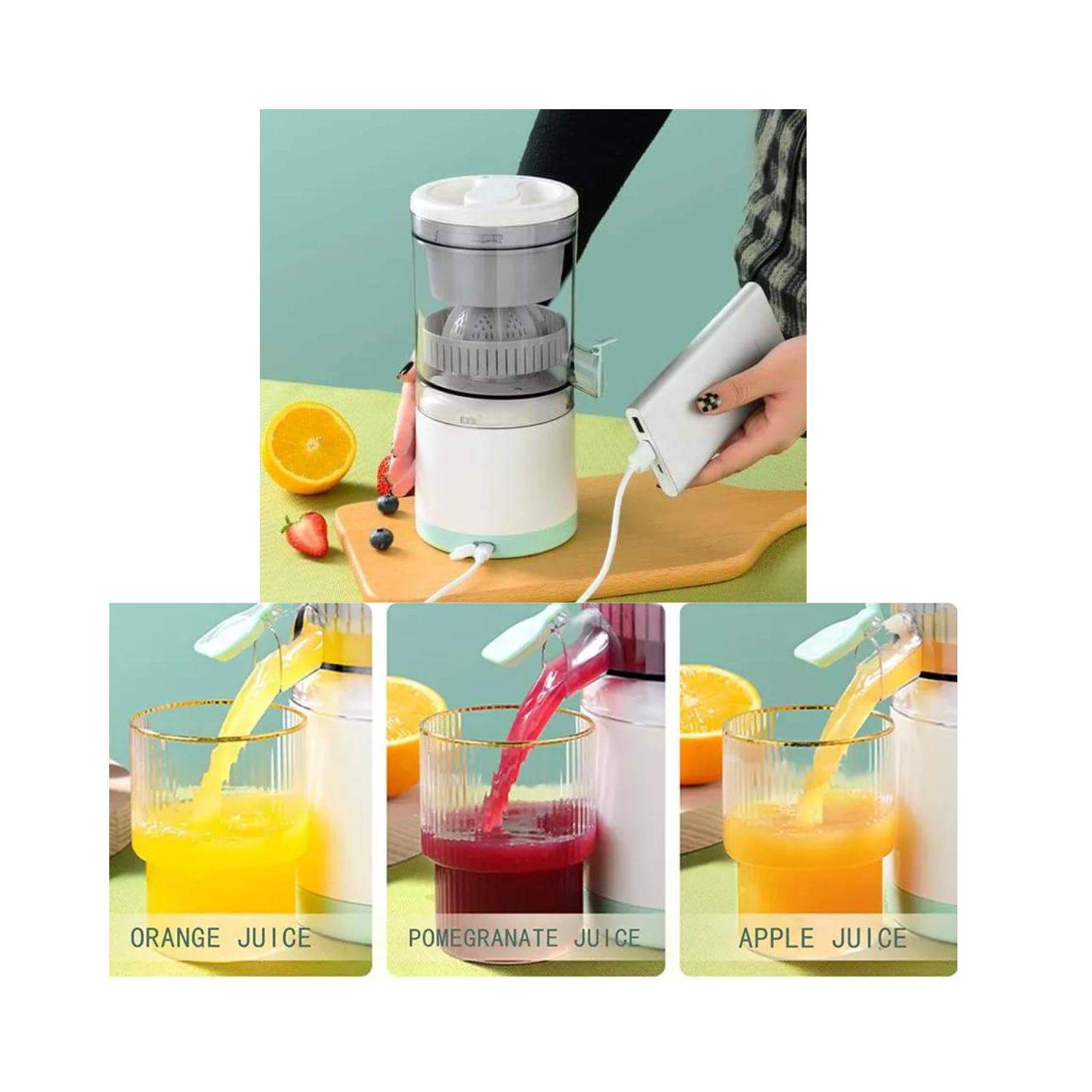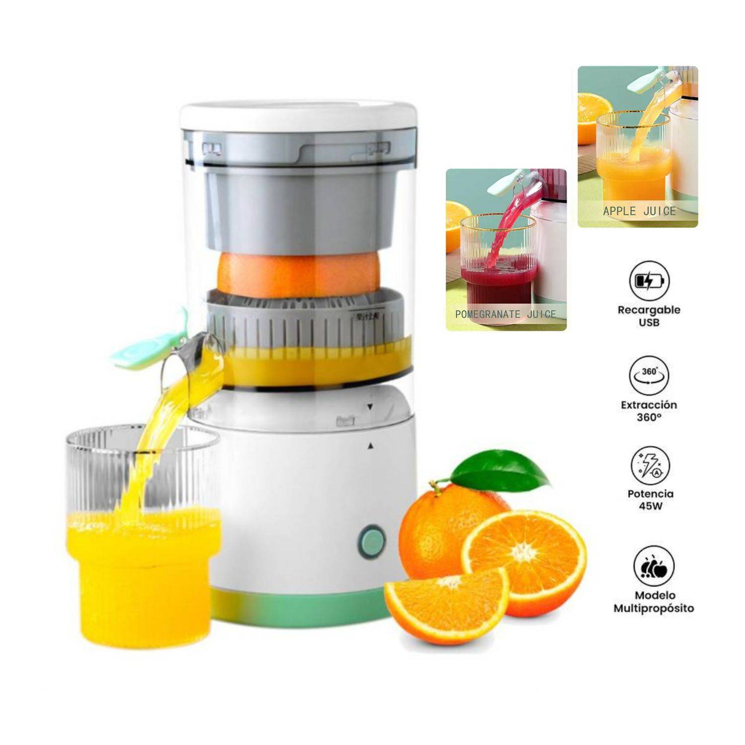 - Recargable: Conéctalo fácilmente a una fuente de energía para recargarlo y asegurarte de que esté listo para tu próximo antojo de jugo.¡Disfruta de tus desayunos y meriendas de una manera refrescante y saludable con tu Exprimidor Eléctrico Portátil Recargable!